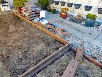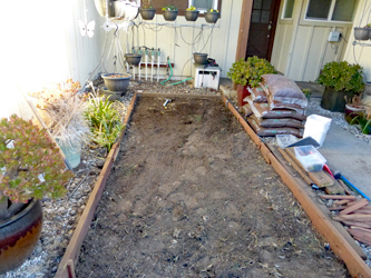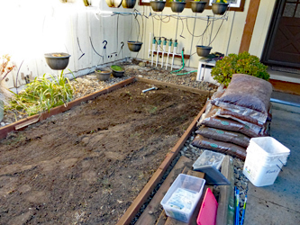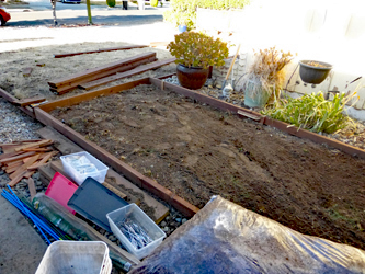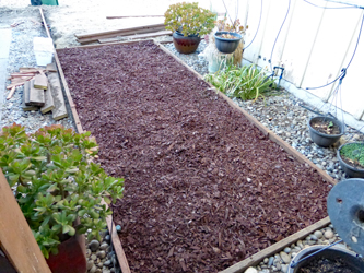 When I started, I was not sure where I was going nor what I could accomplish So I started with the first, the smallest box This area is essentially level making it less difficult Framed it with pressure treated 2/4's and evened up the inside Covered the area with garden cloth to prevent weeds Filled it with wood chip ground cover |