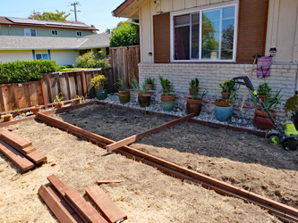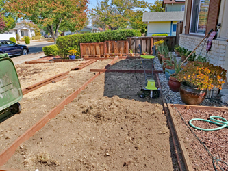My Front Yard Slopes from the House to the Street And West to East A set of boxes will create a set of Flat & Level Areas Now, getting the perimeters exactly level is a challenge that I almost accomplished But, it took quite a while and a good deal of tweaking Then, after the perimeters were set, came the digging of the box bottom to achieve the level area It took a lot of work and a lot of learning |