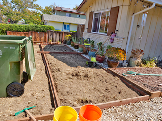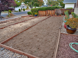 Notice in some of the photos a small, electric rotortiller. This little tool was all I had to level the rock-hard dirt and to get it down to the height for the boxes. |
